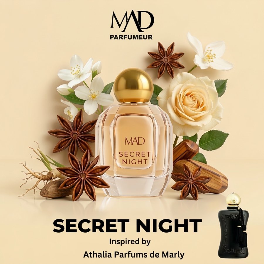 Mad Secret Night הוא ניחוח שמספר סיפור של לילה – מפגש בין אור לחושך, בין רוך לעומק. הוא נפתח בפריחה עדינה, מתפתח ללב ארומטי ורך, ונסגר בבסיס חמים ועצי שמשתלב בצורה טבעית ומרשימה על העור.