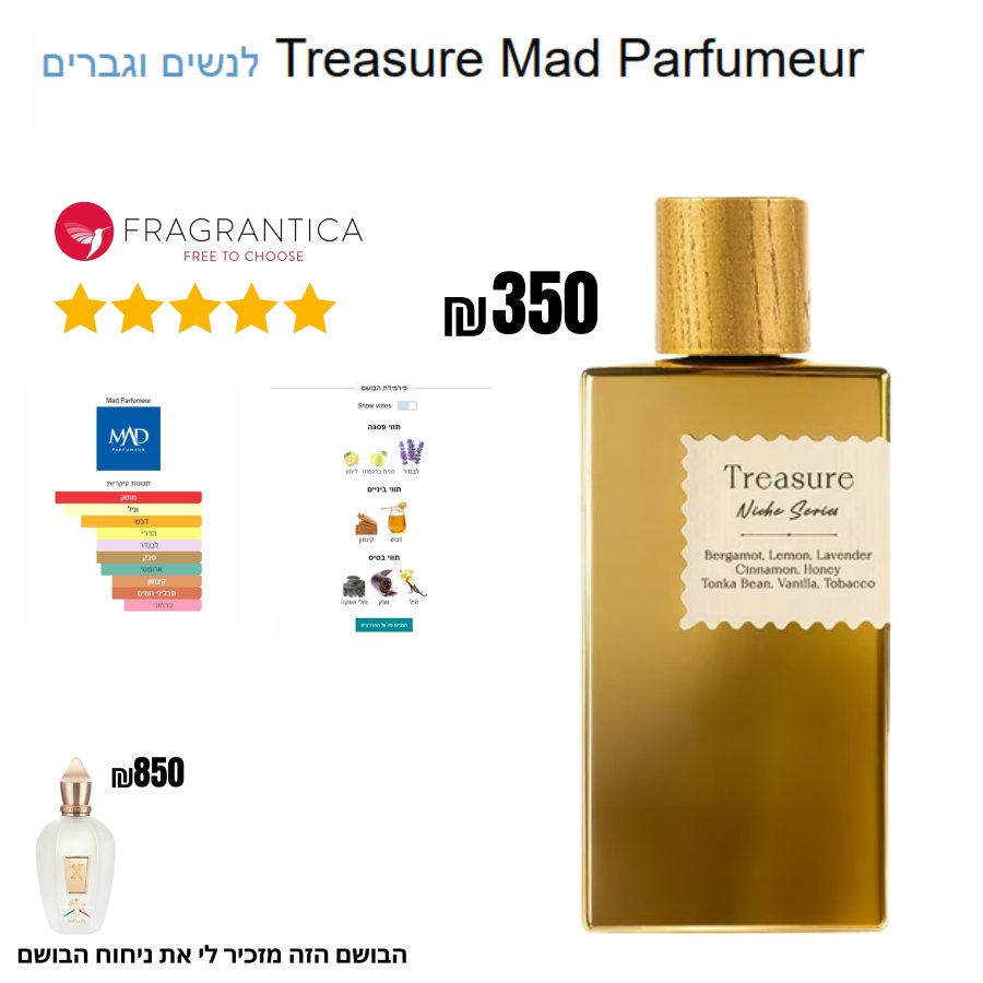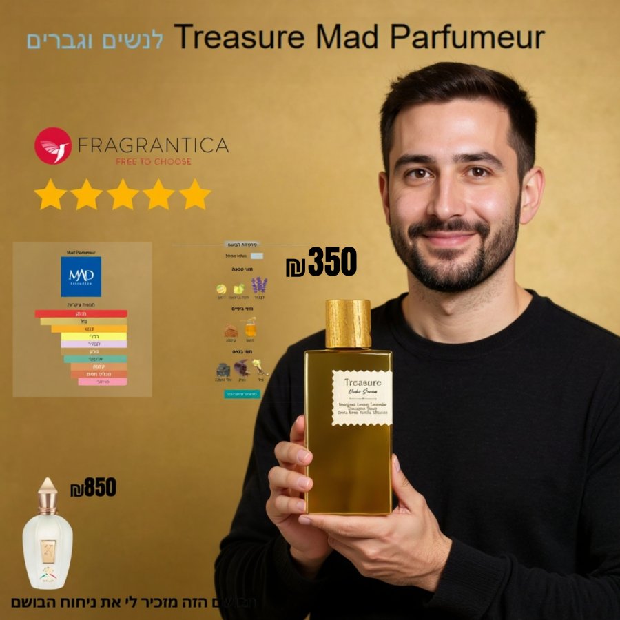 הבושם Treasure של חברת Mad Parfumeur הוא ניחוח מזרחי יוניסקסי, עשיר ועמוק, המתאים לנשים ולגברים כאחד.