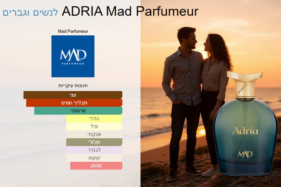 ADRIA מבית MAD Parfumeur הוא בושם אוריינטלי יוניסקס שמתאים לנשים ולגברים (2025). הוא מאופיין בשילוב טרי-ארומטי בתחילה ובסיום חם-עצי עם עומק מפתיע.